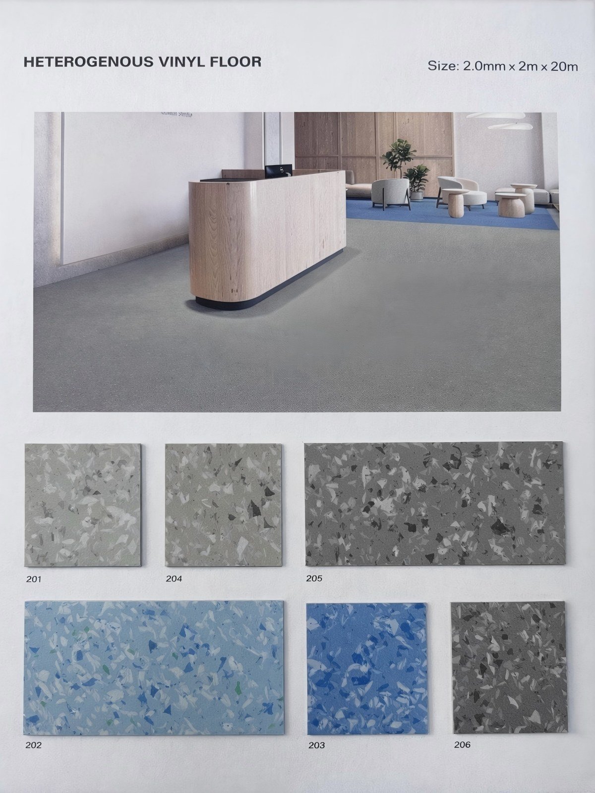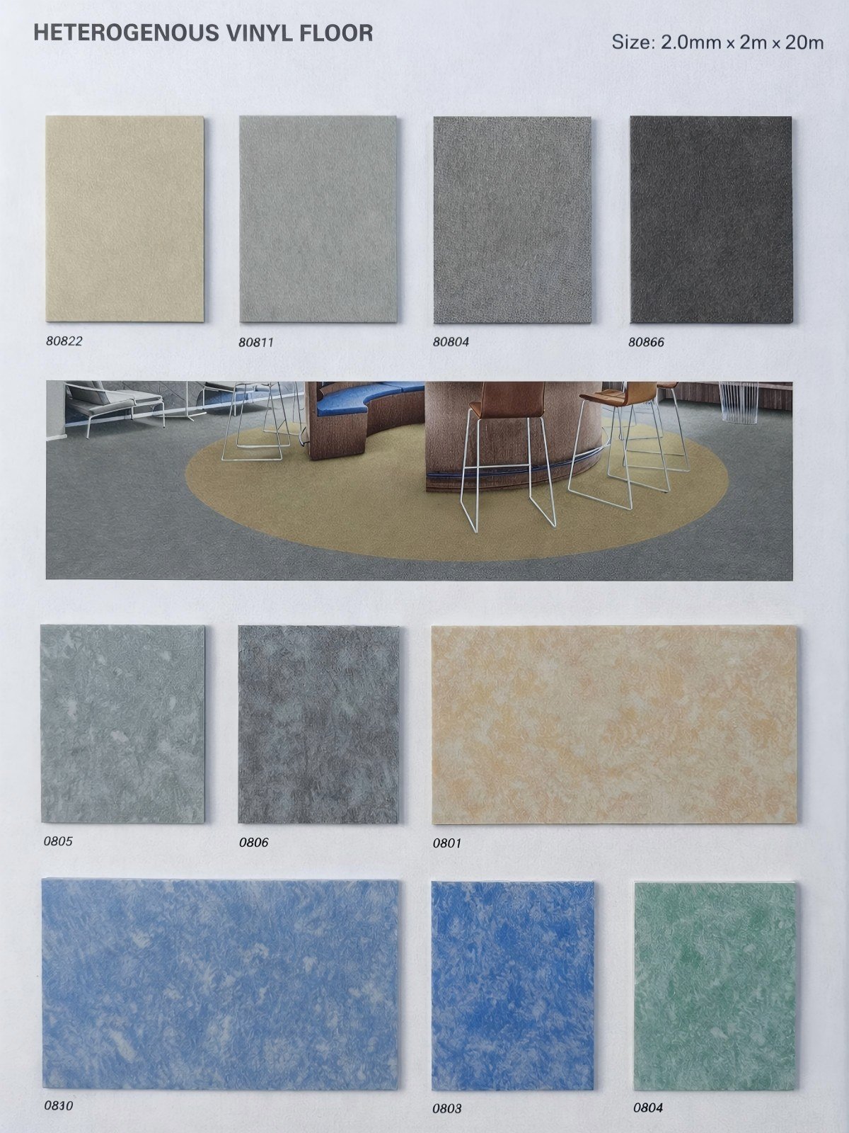 Heterogeneous vinyl flooring is a multi-layer commercial flooring solution designed for durability, easy maintenance and stable performance in high-traffic interior environments.